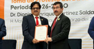 El rector de la Universidad Autónoma de Tamaulipas (UAT), Dámaso Anaya Alvarado, encabezó la toma de protesta del Dr. Dionisio Enrique Martínez Saldaña como director de la Facultad de Medicina Matamoros
