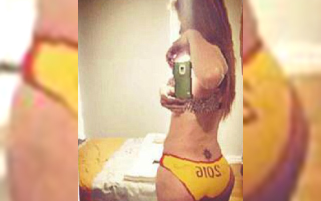 La selfie tomada dentro de una habitación, muestra a una sexy Mhoni vestida con una prenda interior amarilla,con vivos rojos y el ‘2016’ bordado en el mismo color, además de un sostén en animal print