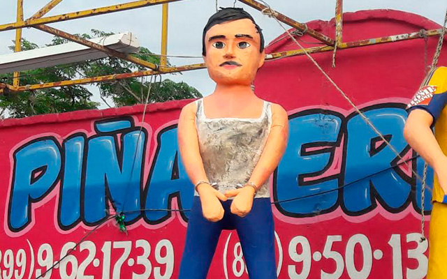 En Reynosa la piñatería Ramírez realizó una piñata del capo más buscado del mundo, luciendo su playera de resaque sucia y esposado