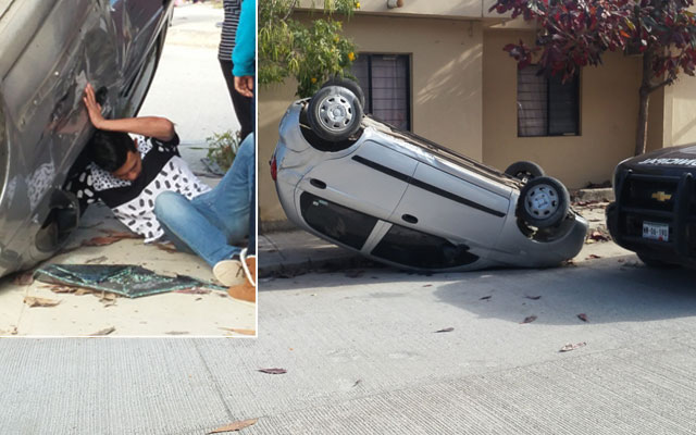 Al rebasar indebidamente al carro de transporte, éste le pega por atrás y ocasiona que el coche compacto pierda estabilidad y quede llantas arriba