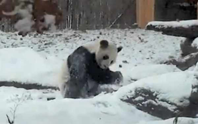 Tian Tian, de 18 años de edad, y el ozesno Bei Bei se divierten en la nieve en el zoológico nacional Smithsoniano de Washington