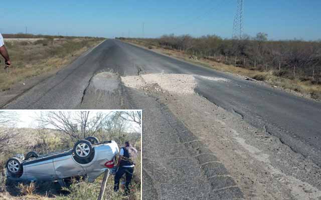 Un enorme hoyo en la carretera o hundimiento, hacen que la conductora de una camioneta se salga del camino y de volteretas. Fue llevada al hospital.