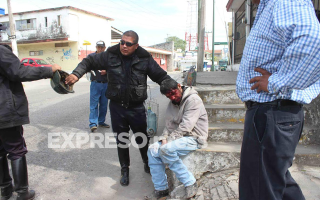 El sujeto cuya edad es entre los 40 y 50 años, delgado, cabello negro, bigote y barba, se cayo y quedo tirado a mitad de la calle