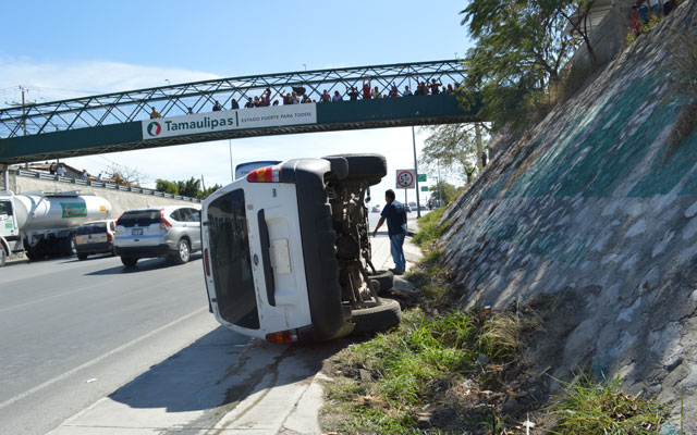 Conductora de una camioneta pierde la dirección de su vehículo, al chocar primero con un coche compacto. Luego se va a una pared que trepó y que le hizo volcarse. Socorristas acudieron auxiliar a los accidentados