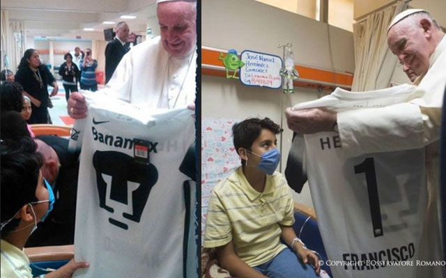 El papa Francisco visitó ayer domingo a niños enfermos del Hospital Infantil «Federico Gómez», donde fue recibido por un comité con una playera de los Pumas de la UNAM como obsequio.