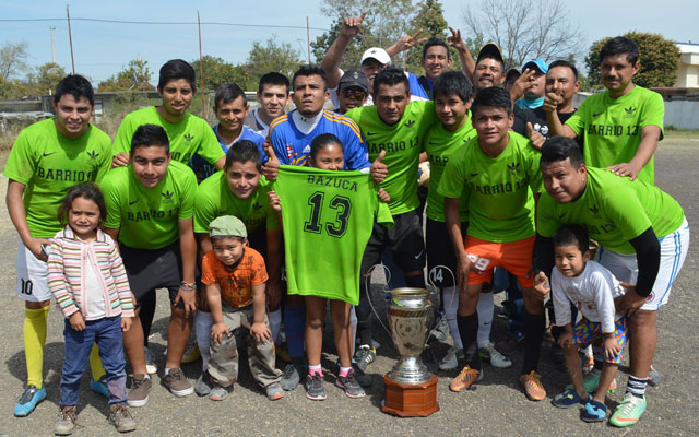 CIUDAD VICTORIA, Tamaulipas.- Goles de Marco “El Abuelo” Sáenz y Miguel “Bazuca” Bocanegra, el siempre protagonista Barrio 13 se coronó ayer campeón al vencer 2-1 a SinFu en actividad del torneo de Copa en la Liga de Fútbol “Lic. Rubén David Rivera Rodríguez” que domingo a domingo se celebra en la Unidad Deportiva La Libertad.