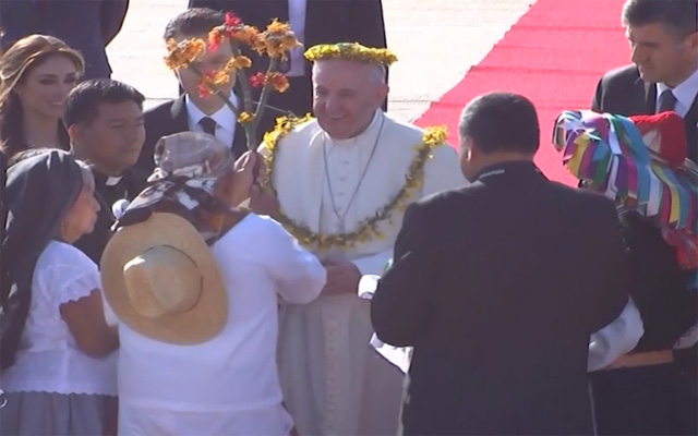 El Pontífice fue recibido por el arzobispo de Tuxtla Gutiérrez, Fabio Martínez Castilla y el obispo auxiliar José Luis Mendoza Corzo, así como por el gobernador Manuel Velasco Coello, su esposa Anahí Puente, y el secretario de Desarrollo Social José Antonio Meade y su esposa.