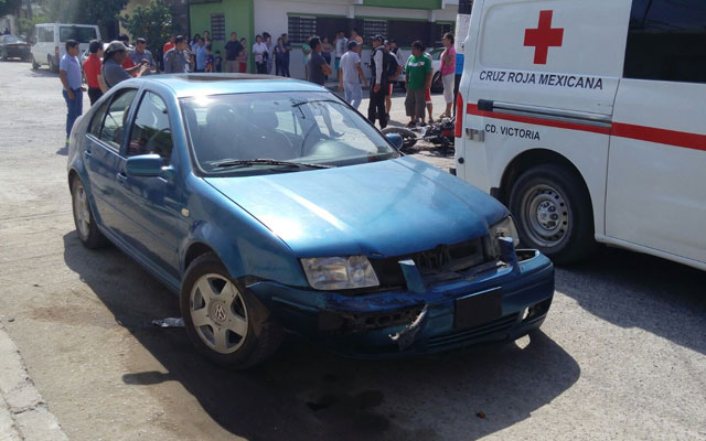 Un coche propiedad del Gobierno del estado les da un cerrón, cuando éste sale de un retorno. Los motociclistas al impacto salen disparados a varios metros