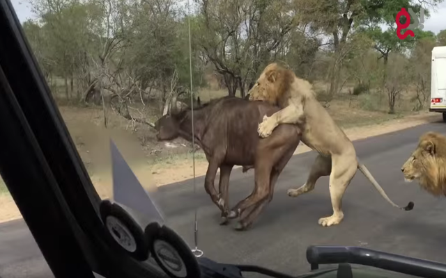 Cuatro leones mataron a un búfalo para devorarlo en el Parque Nacional Kruger de Sudáfrica frente a un grupo de turistas que grabaron todo en un video.