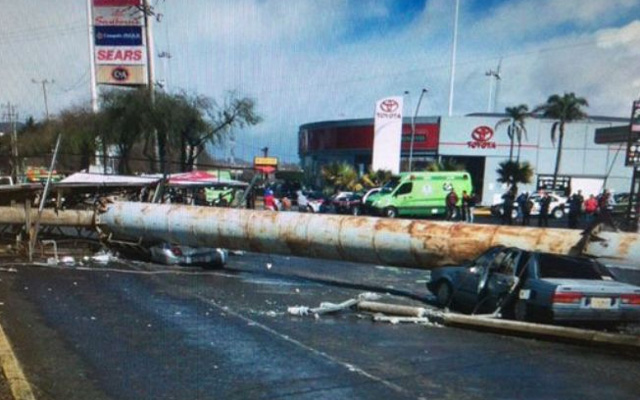 Los fuertes vientos y lluvias que se registraron esta mañana de miércoles provocaron que el gran espectacular, con todo y soporte se derrumbara sobre la vialidad frente a Galerías Metepec