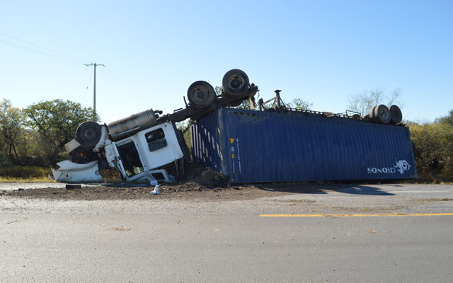El cansancio hizo presa a un chofer quien al perder la dirección de su camión se salió del camino y acabó llantas arriba. El garrotero que lo acompañaba salió lesionado
