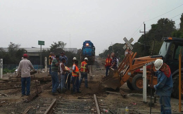 Para agilizar las maniobras, personal de la Secretaría de Obras Públicas del ayuntamiento apoya a los trabajadores de Ferromex.