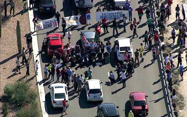 Decenas de manifestantes cerraron el Bulevar Shea en dirección al este, la principal ruta de acceso al suburbio, donde Trump tiene programado un mitin para este mediodía, de acuerdo con la estación de televisión ABC 15 de Phoenix.