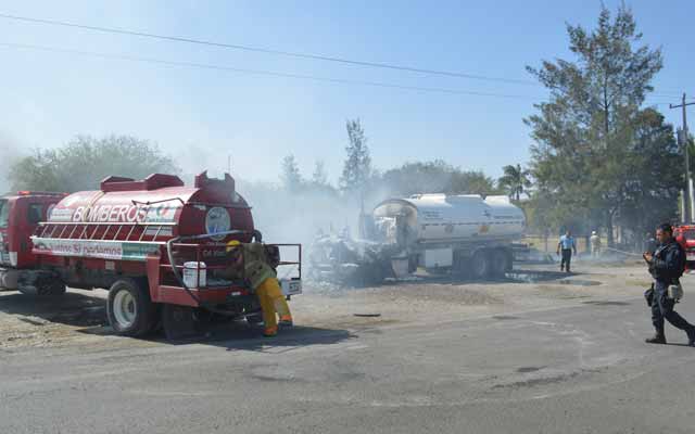 Aparentemente el incendio a un pastizal alcanza al camión que se hallaba estacionado. El vehículo acababa de ser cargado con 20 mil litros de gasolina. Personal federal cerró la circulación