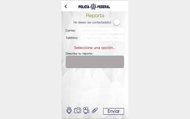 Una de las opciones de la aplicación es reportar los hechos delictivos a través de grabaciones de audio, fotografías, vídeos o documentos, los cuales se adjuntan con la denuncia