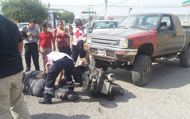 Chofer irresponsable sale de una gasolinera y no se percata que en una motoneta se acercaban los afectados. El adulto tuvo que ser llevado a un centro hospitalario