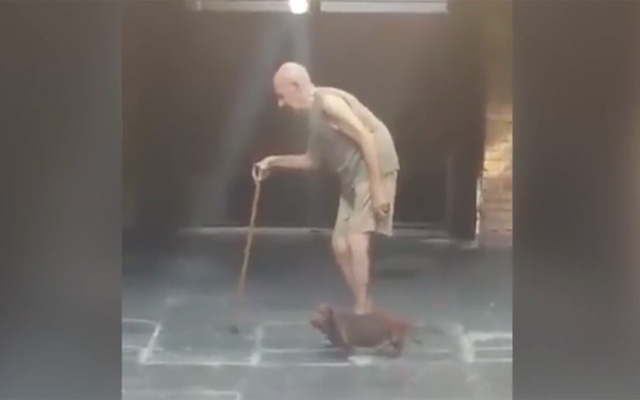 El video muestra la tierna escena en que un señor mayor pasea a su perro con una mano mientras con la otra sujeta su bastón