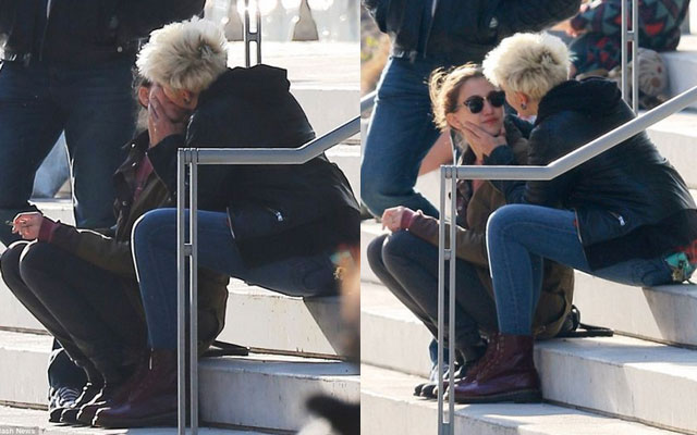 La acompañante de Paris tenía puestos unos lentes oscuros mientras platicaban antes de que ambas compartieran un tierno beso.
