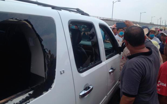 Mujeres, hombres y niños que acudieron al complejo a reconocer los cuerpos de sus familiares reportados como desaparecidos rompieron los cristales de las dos camionetas Suburban que pasaban por el lugar con integrantes de dicha organización sindical