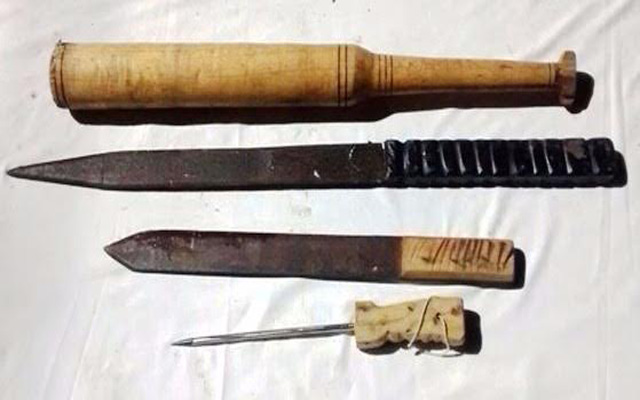 Además 18 espátulas, 30 cuchillos, 24 desarmadores de diferentes tamaños, 139 puntillas, nueve martillos, cinco seguetas, seis tablas hechizas, tres bastones, 13 brocas, 42 discos de películas, un calentador de agua, un decodificador, ocho machetes, 15 varillas, 12 pinzas y una licuadora.