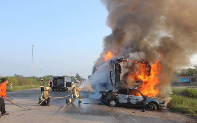 Automóvil invade carril y choca contra un autobús de pasajeros en el tramo Mante-Limón; el coche se incendia y explota muriendo el chofer carbonizado