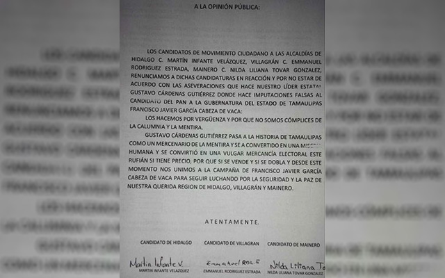Al respecto, Gustavo Cárdenas, Presidente del Partido Movimiento Ciudadano y candidato a gobernador, dijo que no registrará nuevos candidatos en estos municipios