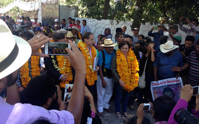 A su llegada a la puerta de la instalación educativa los padres de los 43 desaparecidos les colocaron en el cuello cadenas de cempasúchil a los investigadores internacionales