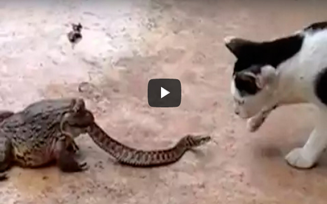 El felino que parece no comprender la situación, continúa molestando a la serpiente que trata de atacarlo pero es arrastrado por el sapo que la va devorando poco a poco.