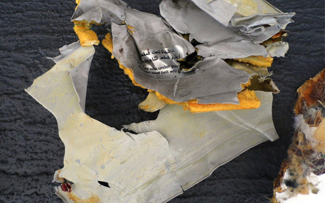 Fragmentos del avión con la marca de la aerolínea egipcia, partes de asientos y objetos personales de los pasajeros son algunos de los restos recuperados entre ayer y hoy por las fuerzas navales egipcias.