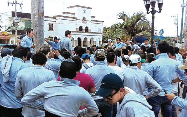 Los huelguistas mantienen el plantón en la plaza principal de la urbe industrial, el cual comenzó la mañana de este sábado.