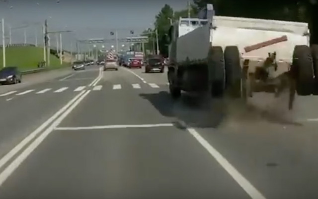 Dramático momento en que un conductor esquiva las ruedas de un camión