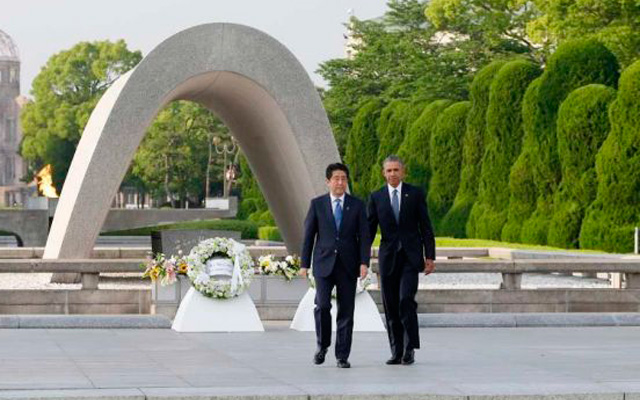 El presidente de EU, llega a Hiroshima en una visita histórica; visita el parque del Recuerdo de la Paz para depositar una corona floral en memoria de las víctimas del lanzamiento de la bomba nuclear en 1945