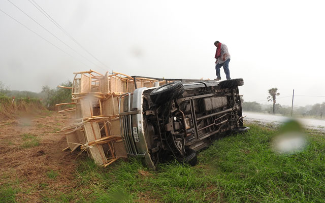 Las fuertes ráfagas de viento que se registraron ayer con la tormenta que se suscitó en la ciudad, provocaron que una camioneta cargada de sillas de palma, volcara