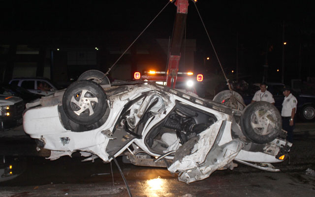Camioneta lo impacta, tumba un poste, choca contra varios tubos de contención y sale disparado del auto