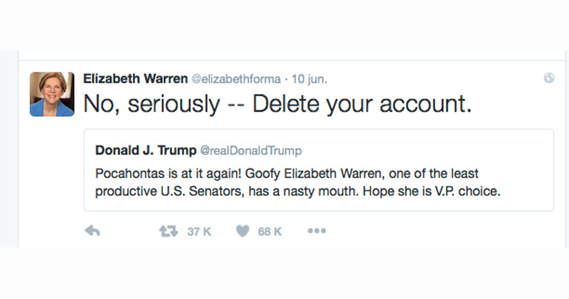 La Senadora Elizabeth Warren, quien podría ser una de las candidatas a compañera de fórmula de Hillary Clinton le dio su apoyo público a la virtual candidata y se sumó a su guerra en Twitter contra el magnate Donald Trump.