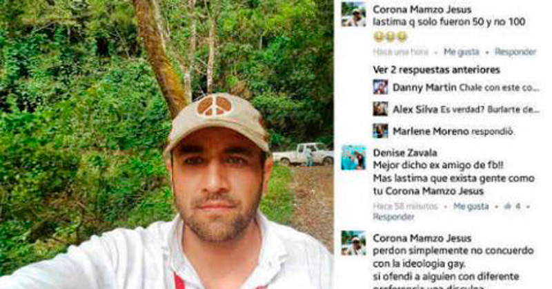 En su cuenta de Facebook, José de Jesús Manzo Corona lamentó que sólo hubieran sido 50 y no 100 los muertos durante el tiroteo en un club gay