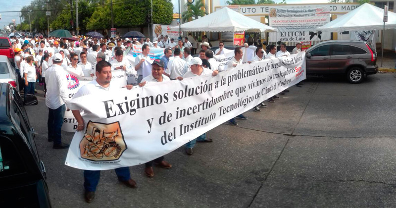 Un grupo de profesores, personal administrativo y de apoyo del Instituto Tecnológico de Ciudad Madero marcha a través de la Avenida Primero de Mayo