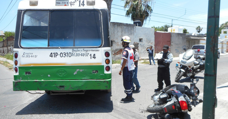 Sufre lesiones en una pierna y golpes en otras partes del cuerpo. El ahora lesionado trató de rebasar un microbús pero el chofer vira en una esquina y al cerrarse el motociclista se estampa con el carro