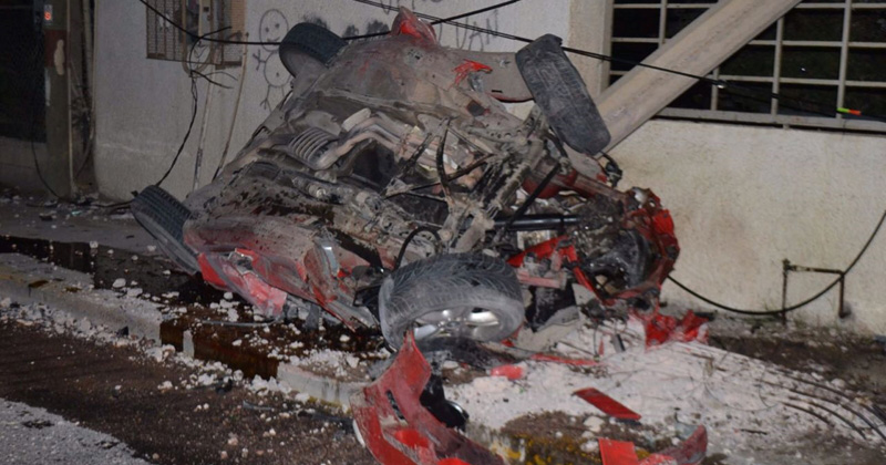 Viajaban en el coche dos personas. Al perder el control su chofer, primero pega con un arbotante y luego se va contra un poste de la Comisión Federal de Electricidad. Hay una persona muerta mientras que la otra esta grave