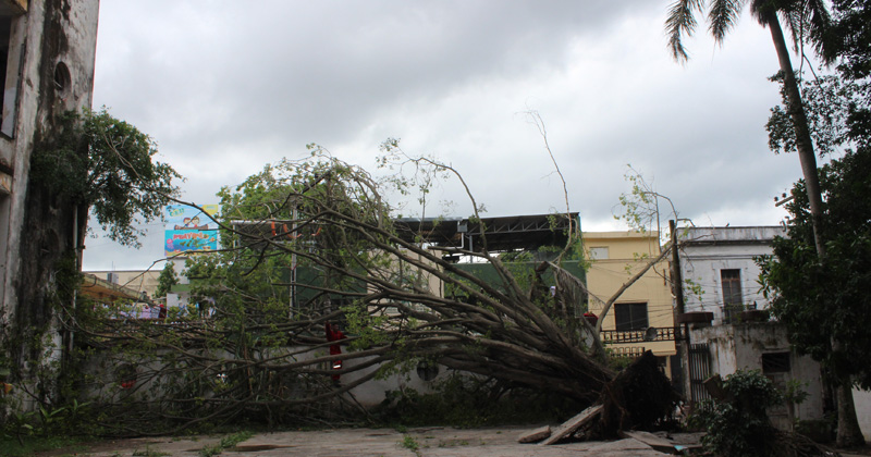 El árbol ubicado en el patio del ex hospital cayó sobre la barda, a la que ladeó y sobre cables de la CFE y Telmex, provocando que se ladeara un poste de concreto