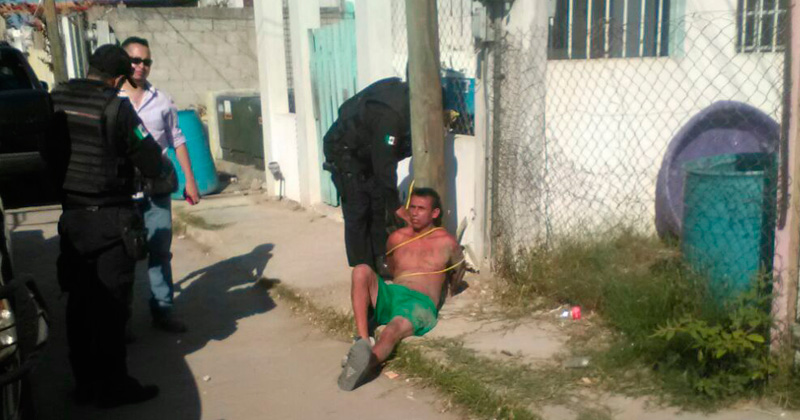 Tras ser perseguido y golpeado, el individuo fue atado con un mecate de plástico a un poste de energía eléctrica.