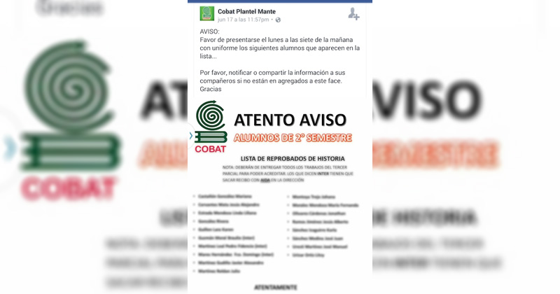 Desde la cuenta oficial del Cobat Mante se publicó una imagen con los “alumnos reprobados de historia”, lo que generó burlas y reclamos; Es violencia escolar”, dice Derechos Humanos