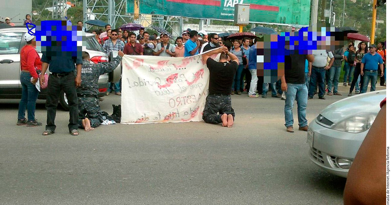 Los federales fueron bajados de la pipa donde estaban retenidos y obligados a sostener una manta con las exigencias de la CNTE