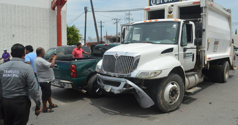 Se trata de un recolector de basura cuyo chofer rebasa el alto obligatorio. Colisiona con dos vehículos. Cruz Roja atendió a una mujer