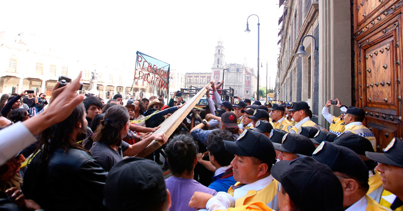 Los jóvenes instalaron un templete en la banqueta, pero los elementos de seguridad trataron de impedirlo