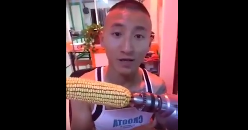 Un desafortunado momento vivió un joven asiático al intentar recrear el reto del elote en el taladro.