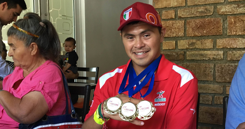 CIUDAD VICTORIA, Tamaulipas.- El triple campeón del Mundo en los Trisome Games que se celebraron en Florencia Italia, Juan Daniel Rodríguez Mascorro, volvió a Ciudad Victoria portando con orgullo en su pecho las tres medallas de oro que consiguió en el certamen y con las que se confirmó como el mejor atleta con Síndrome de Down de todo el planeta.
