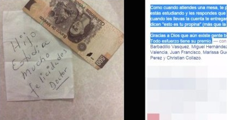 David Barrón , estudiante de medicina que ha trabajado durante 14 años como mesero en un restaurante de Veracruz, se llevo una gran sorpresa cuando una amable clienta le dejó una propina por 500 pesos y en hermoso mensaje.