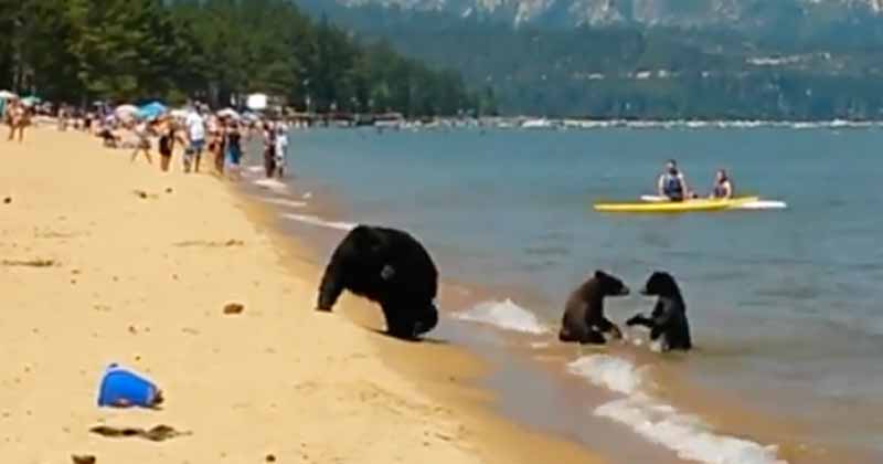 Una familia de osos decidió refrescarse entre los bañistas (Video)