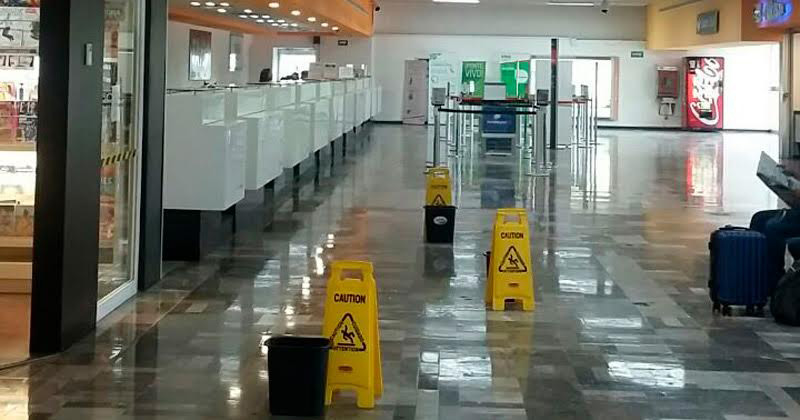 Cuatro cubetas con su respectivo anuncio amarillo de precaución de piso mojado, están colocadas en la planta baja de la terminal aérea